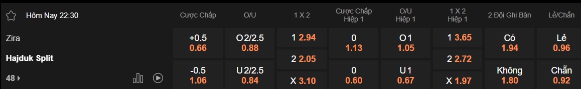 Kèo Châu Á: Với tỷ lệ cá cược hiện tại, các nhà đầu tư nên cân nhắc kỹ lưỡng yếu tố sân nhà của Zira FK. Mặc dù Hajduk Split được đánh giá cao hơn, nhưng lợi thế sân nhà có thể tạo ra sự cân bằng trong trận đấu.